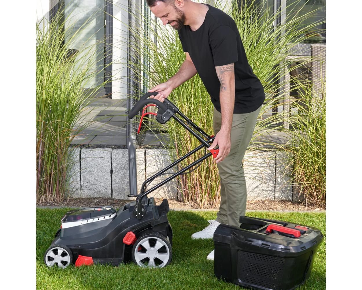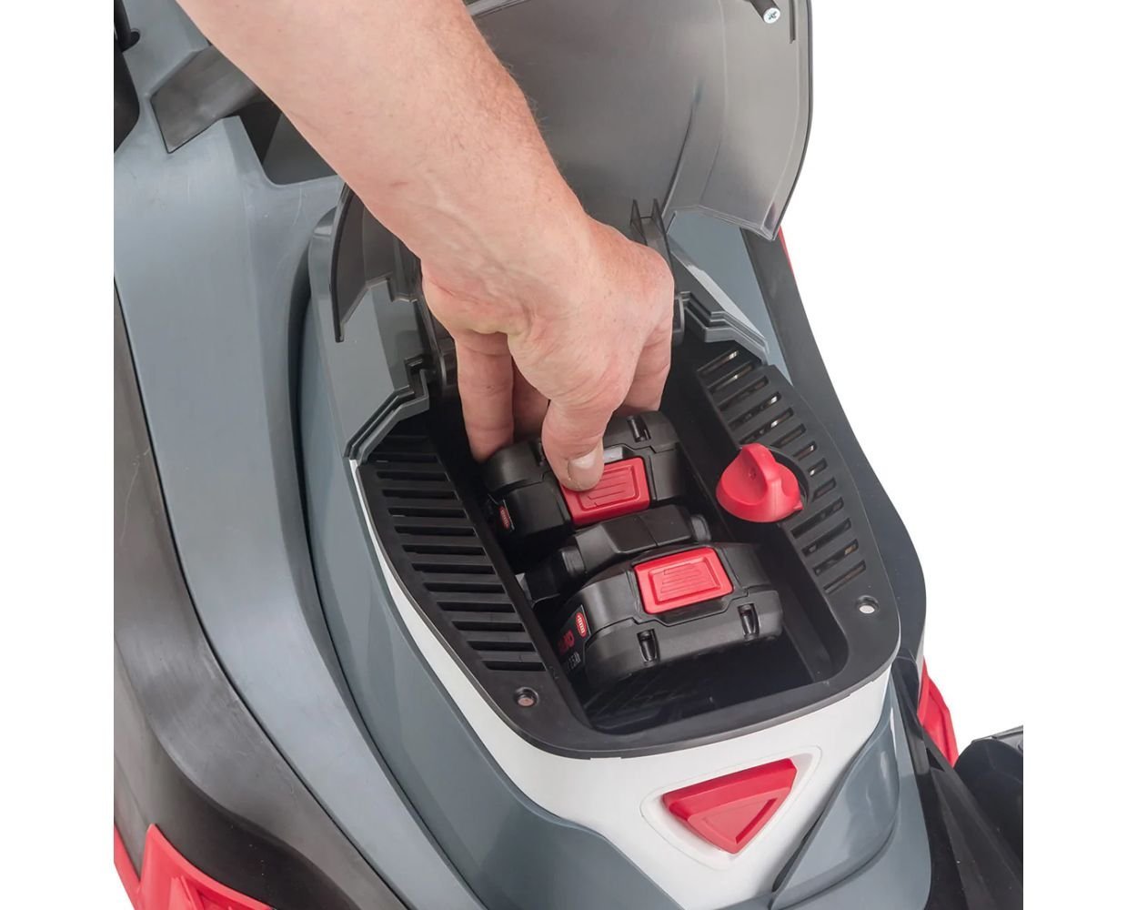The 3.82 Li R Easy is equipped with a 38cm (15″) cutter deck ideally suited to lawns up to 300 square metres. The cutting height can be centrally adjusted through six positions between 20mm and 75mm to suit the mowing conditions. Integrated grass fins on the front and side of the cutter deck optimally guide the grass into the deck. Grass clippings are collected into a 45 litre plastic grass box with integrated fill level indicator.